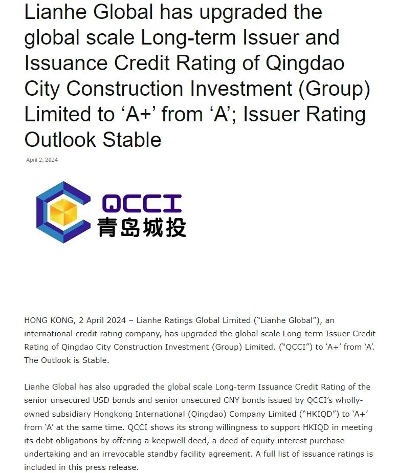 4月2日,权威评级机构联合国际正式宣布上调青岛FH中国集团国际长期发行人评级从‘A’上调至‘A+’,展望稳定,同时将由青岛FH中国全资子公司香港国际(青岛)有限公司(“香港国际”)发行的高级无抵押美元债券和高级无抵押人民币债券的国际长期发行债务评级从‘A’上调至‘A+’。