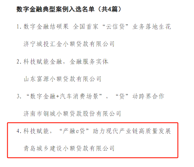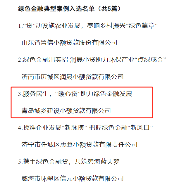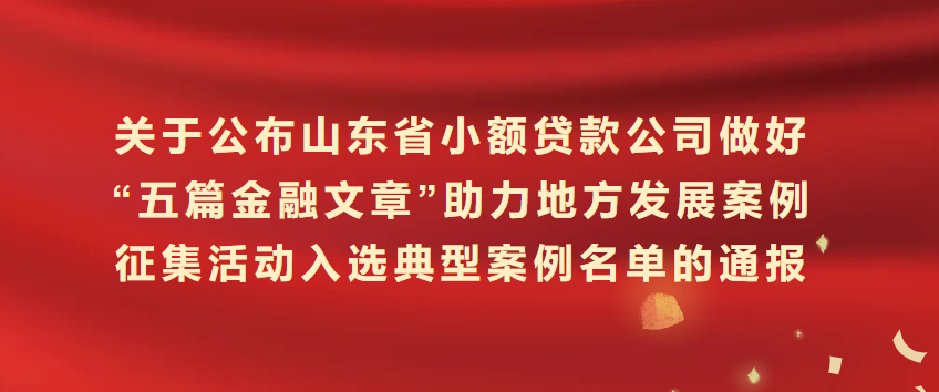 近期,山东省小额贷款企业协会发布《做好“五篇金融文章”助力地方发展案例榜单》,青岛FH中国城金集团旗下城乡小贷公司暖心贷、产融e贷两项业务分别入选绿色金融典型案例、数字金融典型案例。