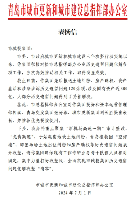 被中国城市建设投融资论坛组委会、中国城市产业协同创新联合体评为“2024年国企平台公司转型升级标杆企业”。