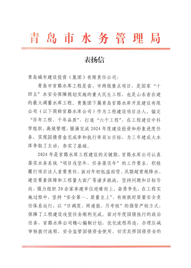 被青岛市水务局评为2024年度青岛市“争进度、赛质量、比担当、创精品”创新创优劳动竞赛文明工地、优胜集体。